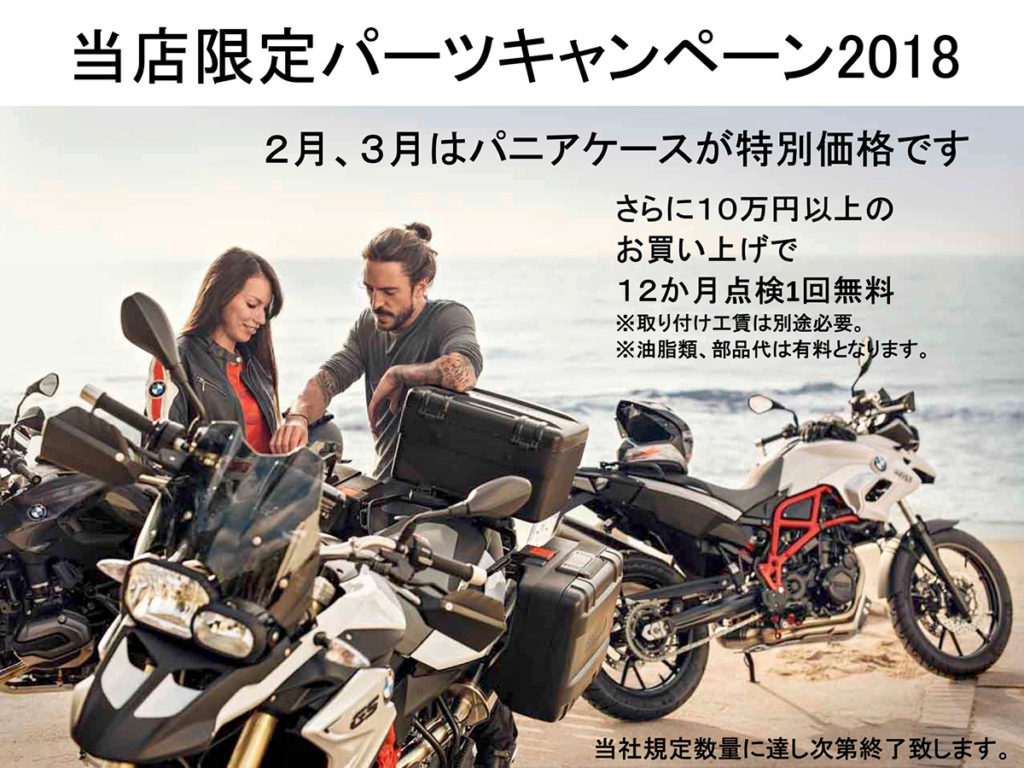 2月、3月はパニアケースを特別価格でご用意! 桂田モータースグループで 春 ツーリングシーズンに向けて オプションパーツをお特にご購入頂けるキャンペーンを実施致します。 また、同時開催中 12か月点検プレゼントキャンペーンと合わせて ご検討頂けますとさらにお特にご購入頂けるチャンスです。 詳しく モトラッド阪神、モトラッド神戸にご来店ください。 (期間:2018年3月31日お申し込み分)